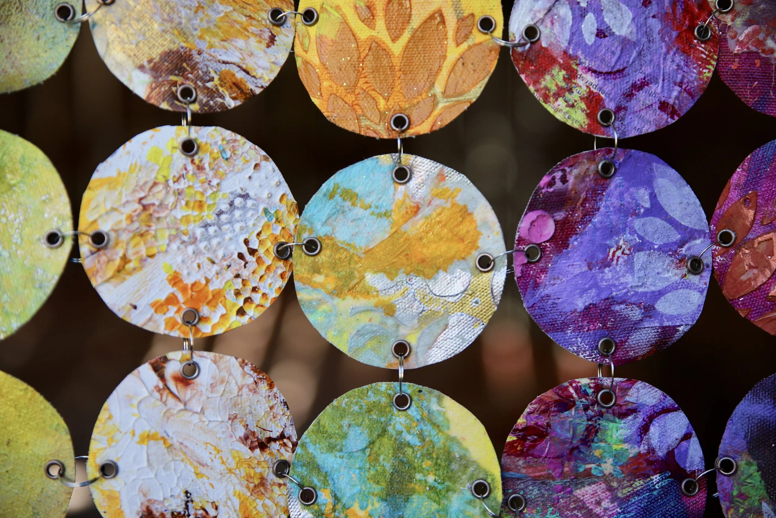 Acrylic and mixed media on canvas. Each circle is hand made, hand cut, then linked together. Each design is unique. They can hang outdoors but do not leave out in the rain, snow or storm winds. They sway beautifully in light wind. They are sealed to help protect them against sun fading and moisture. They can be rolled up for storage. Do not bend circles when your art is cold. The circles may crack. Let them warm in the sun and once warm, you can manually flatten any bent circles.